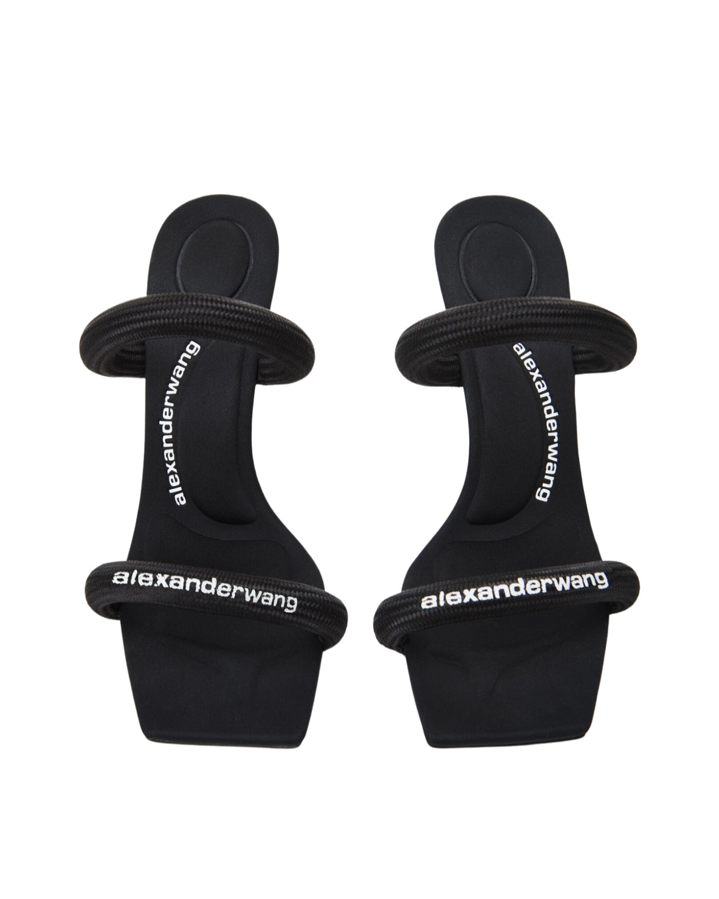 Padded stiletto sandals featuring tubular nylon straps and woven logo detailing. Designed with a square toe, flared enamel-shaped heel, and a custom-molded comfort footbed for added wearability.